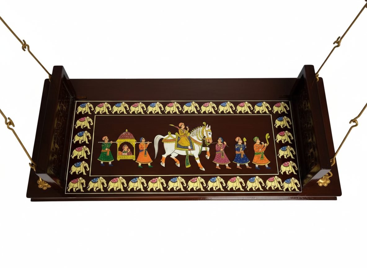 Step into a realm of exquisite artistry and comfort with our handcrafted wooden swing, adorned with a captivating hand-painted plank featuring an intricate Rajasthani elephant design. Each stroke of paint tells a story of tradition, culture, and unparalleled craftsmanship, making this swing a true masterpiece.