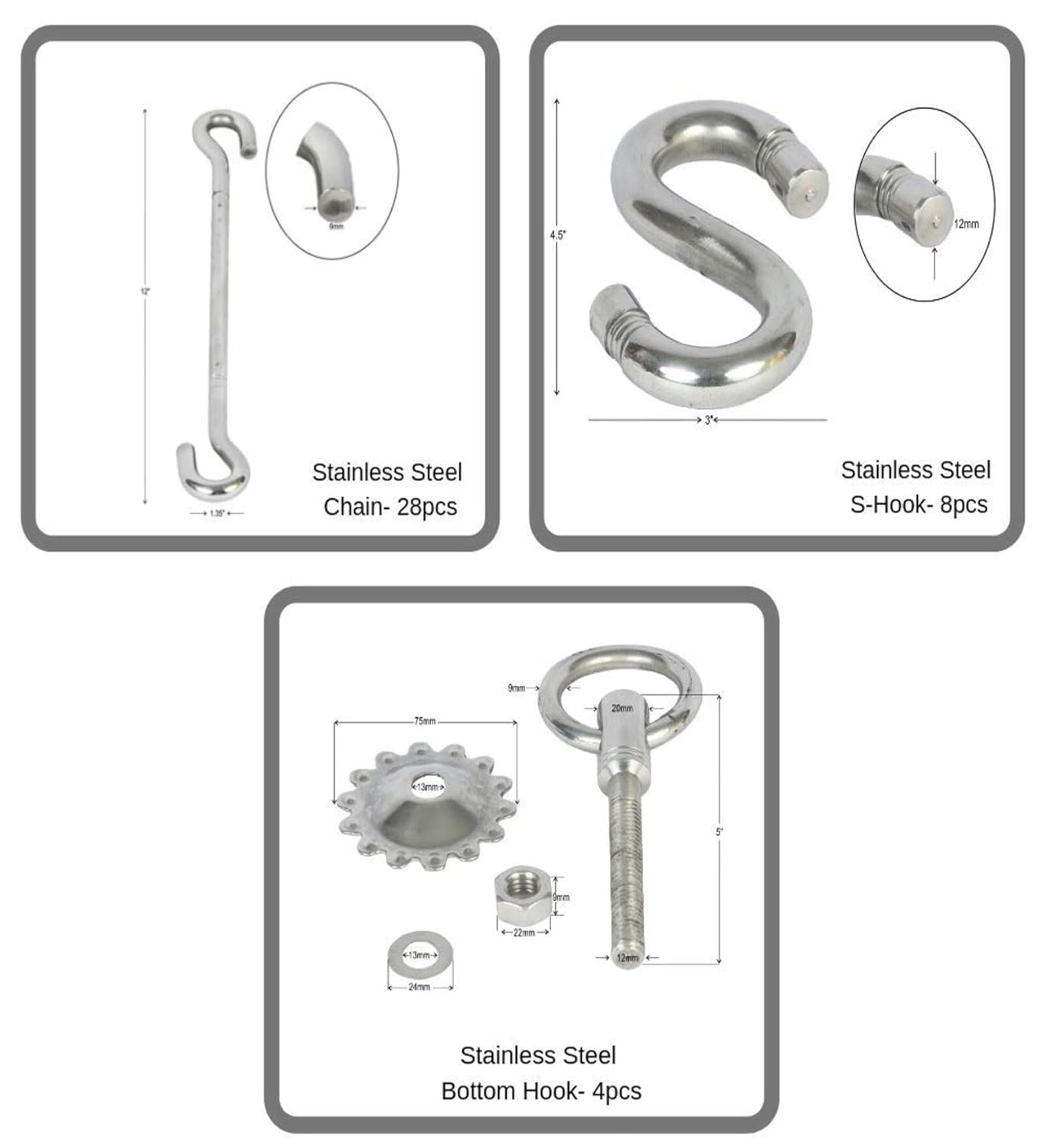 – **4 Kadas (SS):** The stainless steel kadas are strong and durable rings used to connect the swing to the suspension system, ensuring a secure setup.