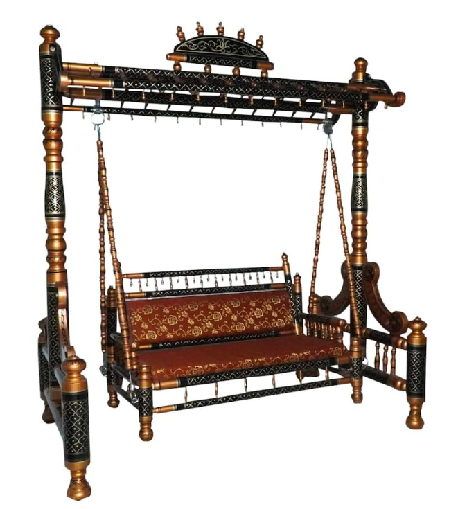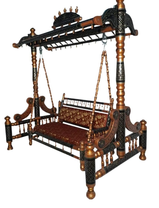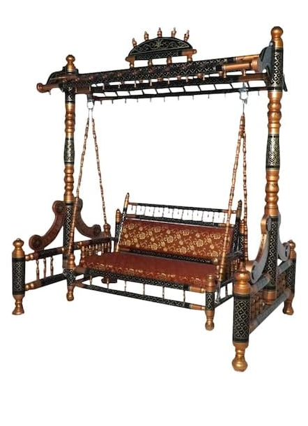 - Wooden Swing is traditionally handcrafted in premium quality Teak Wood. The unit consists of 2 pillars on sides with hand-carved designs. The main swing chair is sturdy enough and is also made of Teak Wood. The chair is attached from the top with metal chain attached.