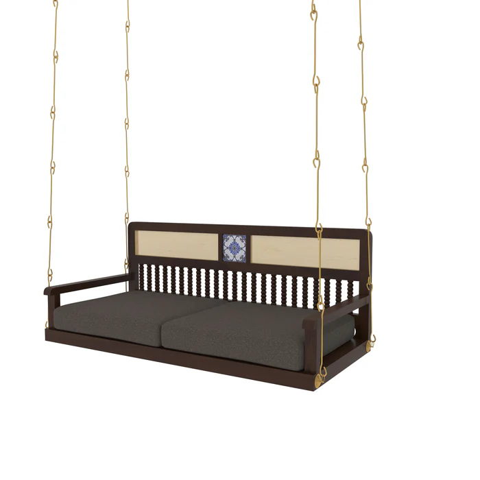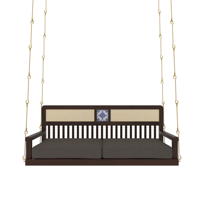 The wooden swing described, with tile backrest, , Handrest and stainless steel accessories and elegant work, is a piece of functional art that combines comfort and aesthetics. Here’s a detailed description: